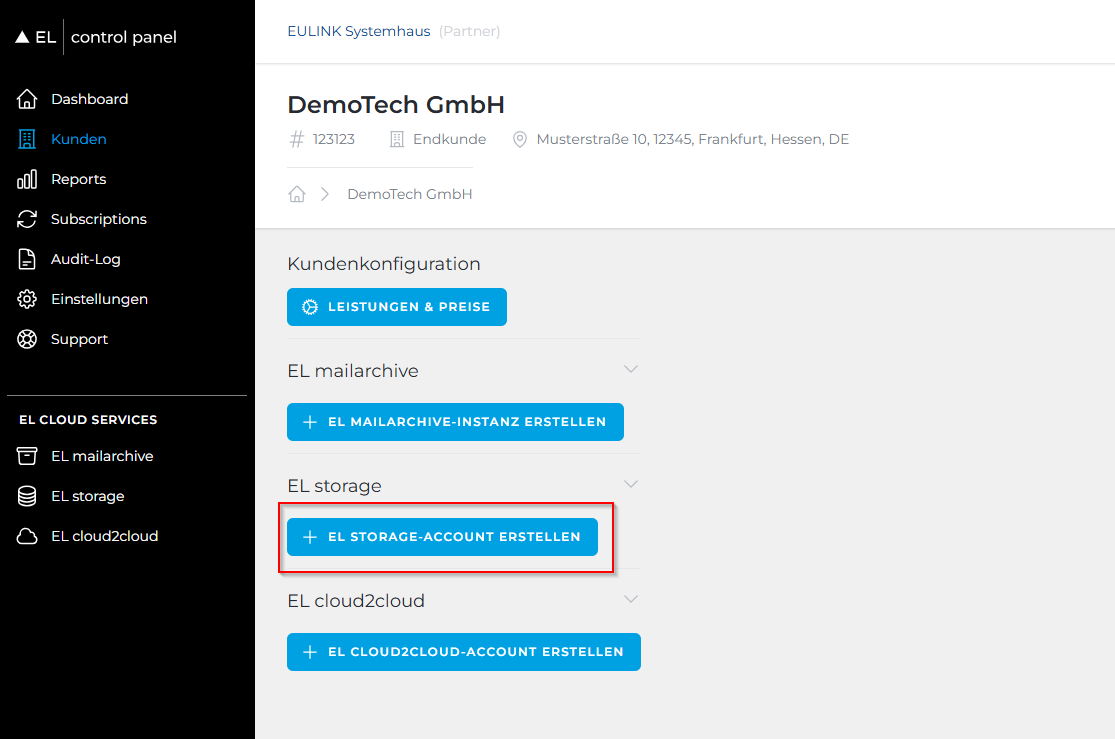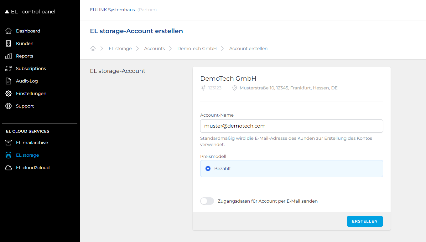 Beim Erstellen eines neuen EL storage-Accounts wird für den Partner folgendes Formular angezeigt: