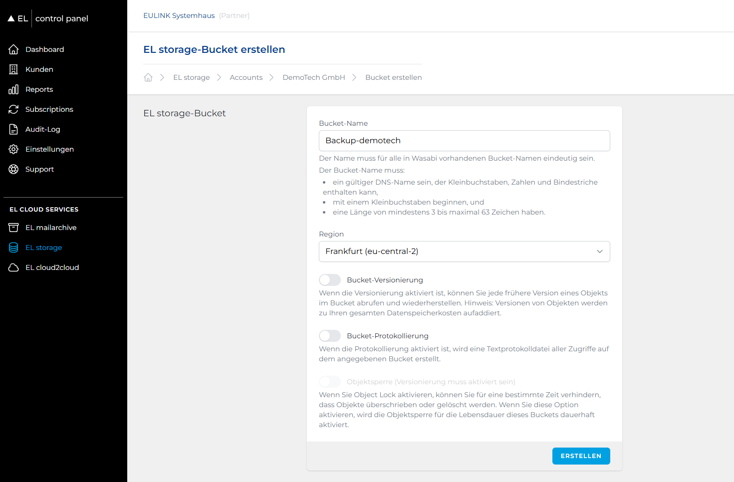 Unter "EL storage-Bucket erstellen" werden Ihnen anschließend die folgenden Optionen zur Verfügung gestellt: