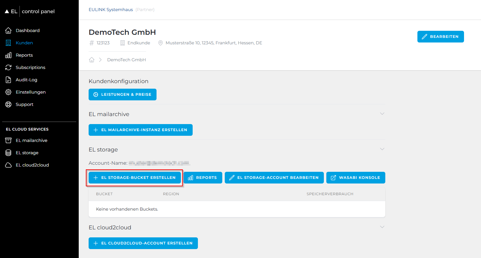 Wählen Sie im Kundenbereich den Endkunden aus, in dessen EL storage Account ein neuer Bucket angelegt werden soll.