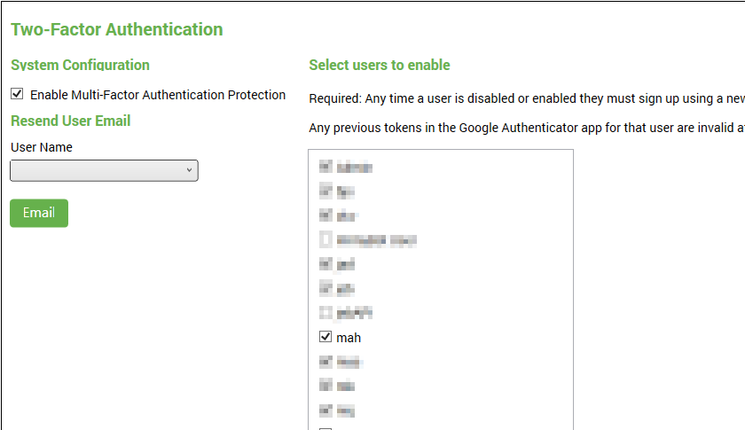 Hier aktivieren Sie die Verwendung des Google Authenticators und wählen aus, welche Benutzer den Google Authenticator verwenden sollen. Nach einem Klick auf "Save" am rechten unteren Bildschirmrand werden die Änderungen übernommen. Nun erhalten die ausgewählten Benutzer eine E-Mail mit der URL für den QR-Code und einen Code zur einmaligen Eingabe für die eigentliche Google Authenticator App. Der QR-Code kann dann beispielsweise direkt mit dem Handy gescannt werden. Des Weiteren wird nicht nur der Google Authenticator, sondern auch andere QR-Code basierte Apps/Anwendungen unterstützt. Dazu zählen "Authy" oder der "Microsoft Authenticator".