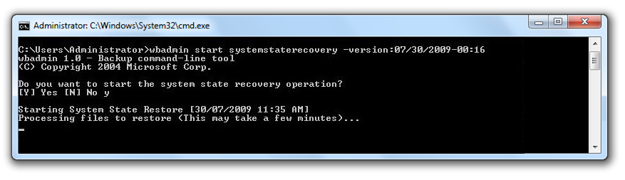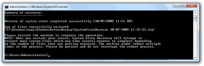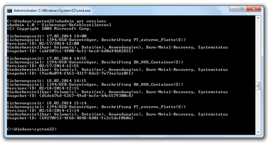 Sie können das erstellte System-Backup für die Wiederherstellung des Systemstatus verwenden. Dieses enthält alle entscheidenden Daten wie Boot-Dateien, Registry-Einträge, Dateien des Active Directory sowie die entsprechenden Systemdateien, die es benötigt. Die Wiederherstellung wird mit wbadmin, einem Tool zur Systemstatus-Wiederherstellung, auf Grundlage eines Image-Backups durchgeführt.