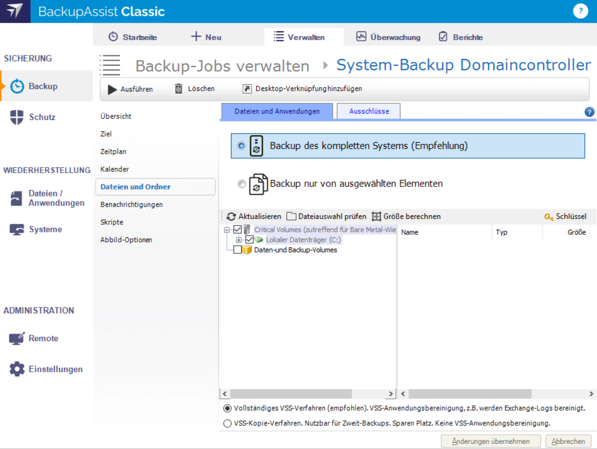 In der Verwaltungskonsole der Backup-Jobs in BackupAssist kann man auswählen, ob nur bestimmte Elemente oder das gesamte System gesichert werden sollen. Empfohlen wird das komplette System.