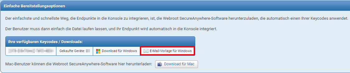 - Dort können Sie den angegebenen Text kopieren und dem entsprechenden Benutzer per E-Mail zusenden. Bei dem Installer, der unter dem Link angegeben ist, ist direkt schon der Keycode/Schlüsselcode hinterlegt, sodass der Benutzer nichts weiter tun muss.