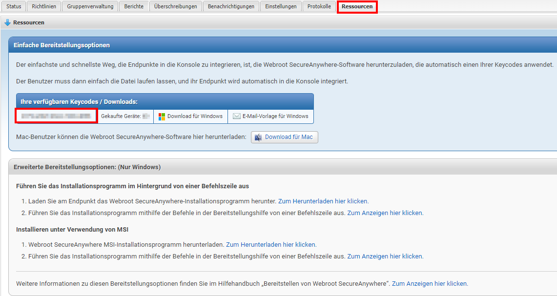 Navigieren Sie in der SecuryAnywhere-Management-Oberfläche Ihrer Location zu dem Tab "Ressourcen", um Ihren Schlüsselcode/Keycode für die Endpoints herauszufinden.