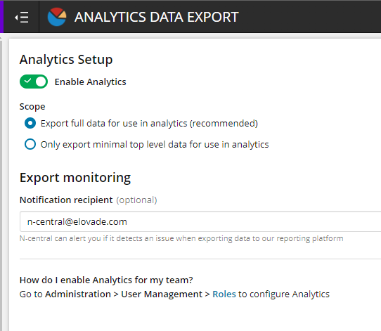 In diesem Artikel wird beschrieben, wie Sie den Data-Export für das N-able N-central Analytics-Feature aktivieren können.