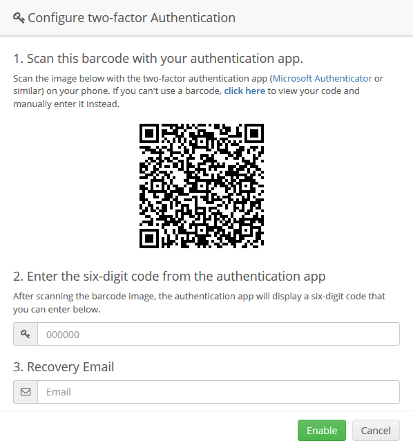 3. Klicken Sie auf [Enable]. Nun öffnet sich ein Fenster mit der Anleitung, wie Sie den Barcode mit der Authentifizierungs-App (z.B. Google Authenticator oder Authy) scannen.