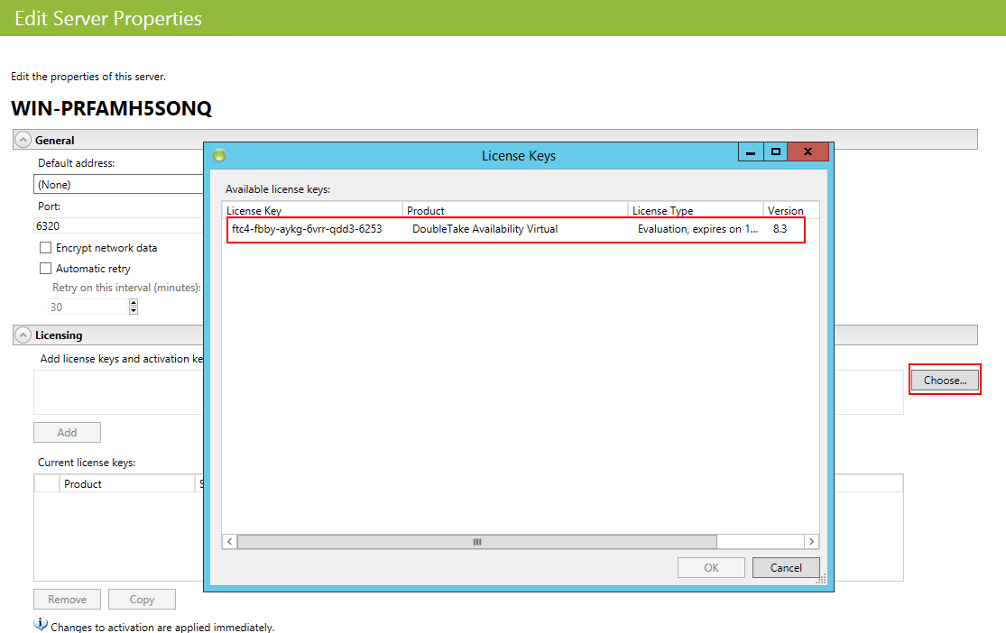 Mit einem Klick auf "Choose" im Bereich "Licensing" können Sie die zuvor eingespielte Lizenz für dieses System auswählen und mit "OK" bestätigen.