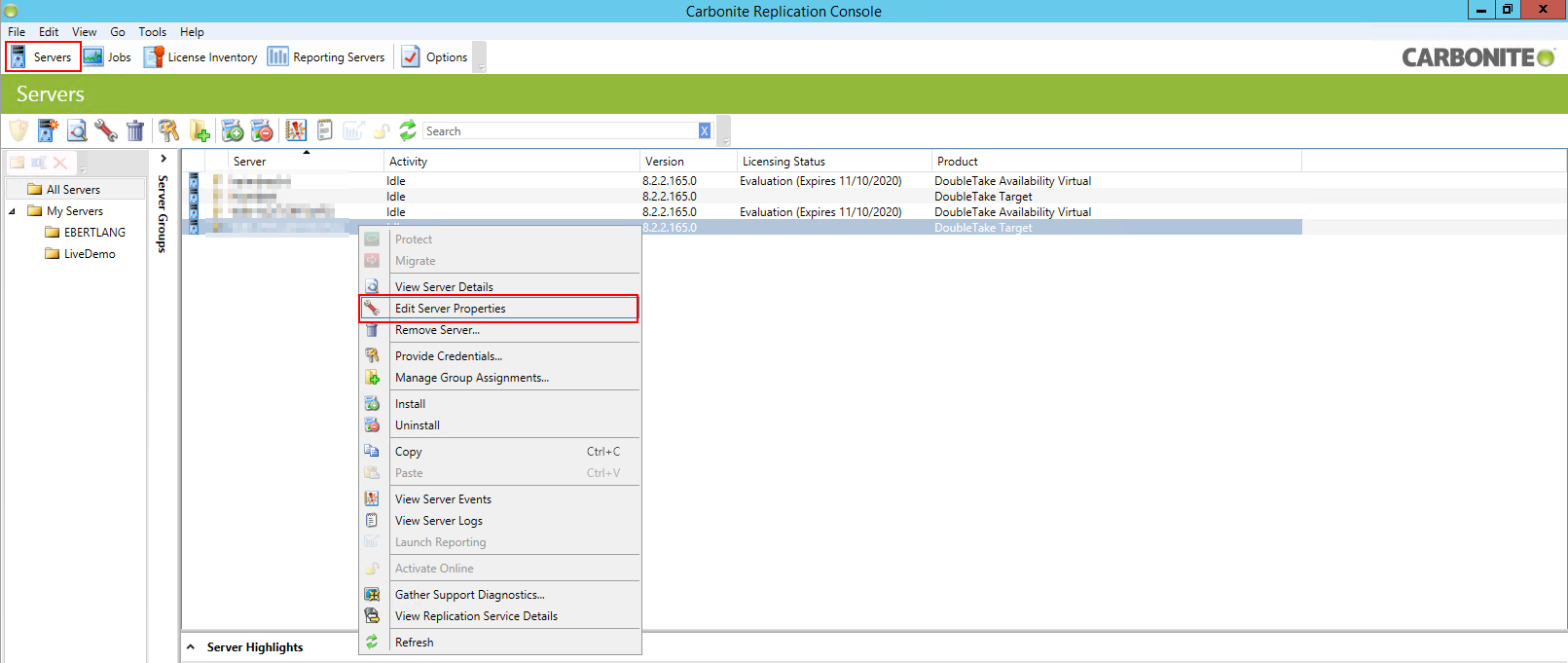 Nach dem Hinzufügen der Lizenzen müssen noch die einzelnen Maschinen, die als Quelle für eine Replikation dienen, lizenziert werden. Dafür wechseln Sie auf den Reiter "Servers" und wählen einen beliebigen Server mit einem Rechtsklick an. Hier navigieren Sie nun zu "Edit Server Properties".