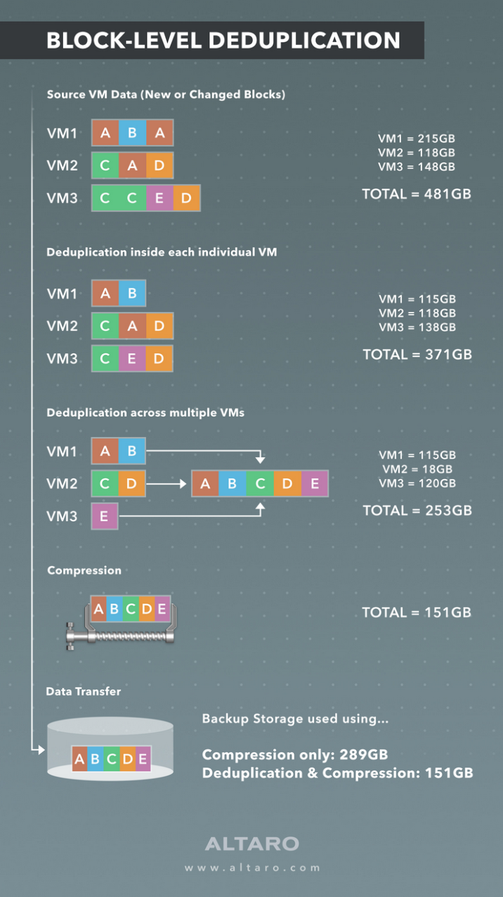 Die VM-Backup-Lösung Altaro VM Backup mit erweiterter Inline-Deduplizierung reduziert die Speicheranforderungen für Ihr Backup-Repository drastisch. Erweiterte Inline-Deduplizierung bedeutet, gemeinsame Datenblöcke - sowohl in einer einzelnen VM als auch global über mehrere VMs hinweg - nur einmal zu übertragen und am Backup-Standort zu speichern. Dieser Prozess erfolgt inline, wodurch sichergestellt wird, dass von Anfang an nur geänderte Daten an Ihr Backup-Repository gesendet werden (anstatt die identischen Daten nach der Übertragung zu entfernen). Das Ergebnis: überlegene Effizienz, drastisch reduzierte Anforderungen an den Backup-Speicher und schnelle Backup-Geschwindigkeiten.