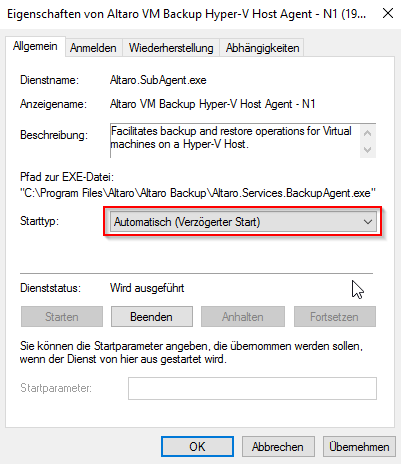 Bitte setzen Sie in diesem Fall den Start-Modus der Dienste "Altaro VM Backup Hyper-V Host Agent - N1" und "Altaro VM Backup Hyper-V Host Agent - N2" auf "Automatisch (Verzögerter Start)". Gehen Sie dazu wie folgt vor: