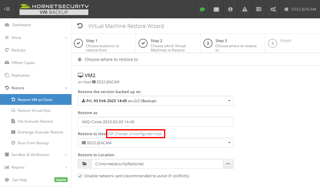 - Wenn Sie an dem Punkt der Wiederherstellung angelangt sind, an dem Sie aufgefordert werden, den Zielhost zu wählen, wird die Option [ODER Unkonfigurierten Host wählen] angezeigt.