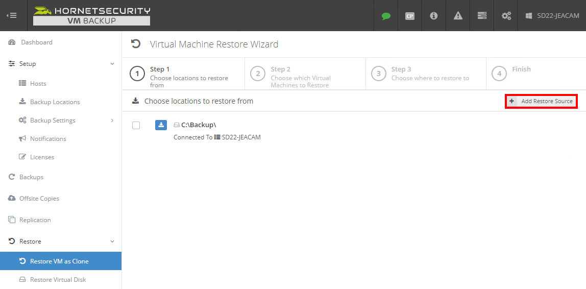 VMs, die mit VM Backup V8 gesichert wurden, können wiederhergestellt werden, erfordern jedoch eine V8-Installation. Eine VM kann sowohl vom lokalen Backup-Speicherort als auch direkt vom Speicherort der Offsite-Kopie wiederhergestellt werden, indem Sie die folgenden Schritte ausführen:
