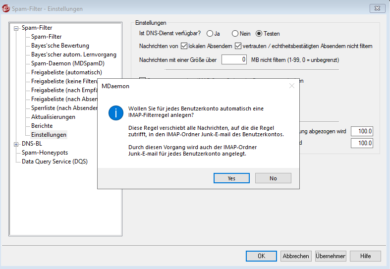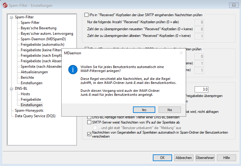 Es wird ein IMAP-Filter angelegt, der auf alle Konten des Servers angewendet wird und automatisch alle Spam-E-Mails in die lokalen Junk-E-Mail-Ordner der einzelnen Nutzer verschiebt.