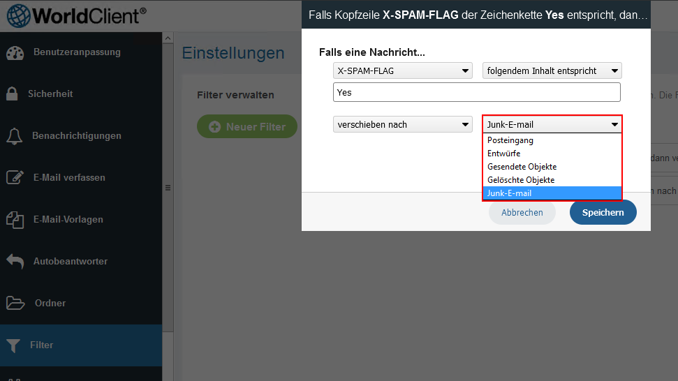 Es gibt zwei Optionen, um den Spam-Filter des WebMails so zu konfigurieren, dass Spam-E-Mails in einen definierten Ordner verschoben werden: