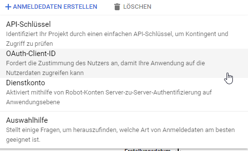 An dieser Stelle wählen Sie "OAuth-Client-ID" aus. Es öffnet sich das nachfolgende Fenster: