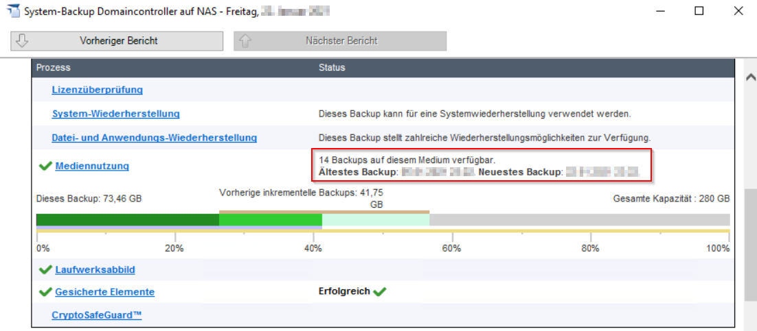 Dies ist danach auch im Backup-Bericht ersichtlich: