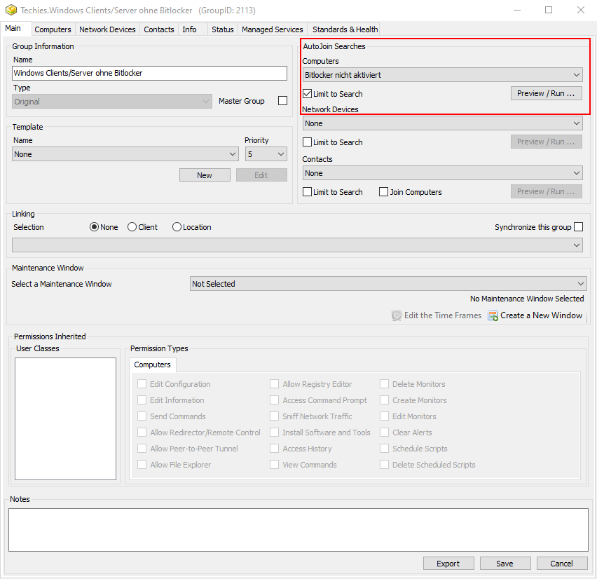 - Anlegen einer Gruppe für alle Agents ohne aktive Bitlocker-Verschlüsselung: