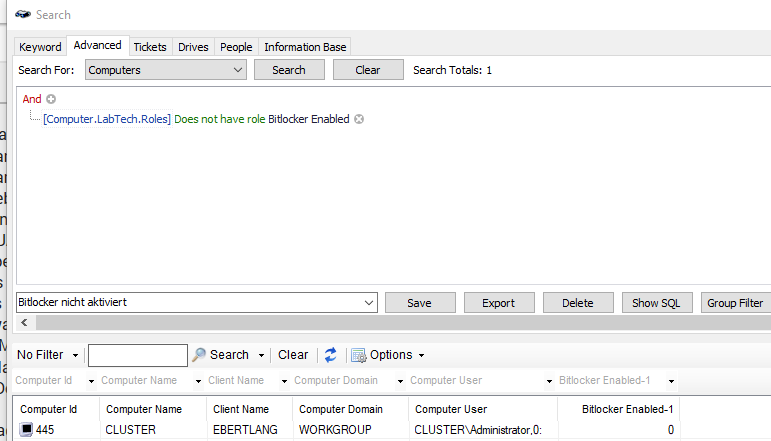 Um das Skript auf alle Agents ohne Bitlocker-Rolle auszuführen, wird eine entsprechende Gruppe benötigt, die alle entsprechenden Agents enthält. Wie Sie eine Gruppe erstellen können, erfahren Sie hier. Danach wird eine Suche angelegt, die alle Agents ohne Bitlocker anzeigt. Diese kann der Gruppe zugeordnet werden. Die Erstellung einer Suche wird hier näher erläutert. Die nachfolgende Suche zeigt alle Agents ohne aktive Bitlocker-Verschlüsselung an; diese kann optional noch auf bestimmte Server oder Clients eingeschränkt werden.