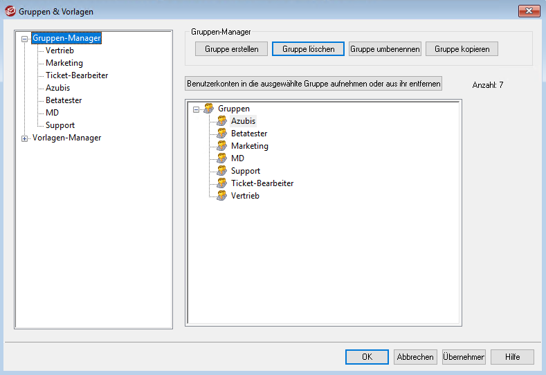 Klicken Sie zum Anlegen der Gruppe bitte im MDaemon Menü auf "Benutzerkonten → Gruppen & Vorlagen".