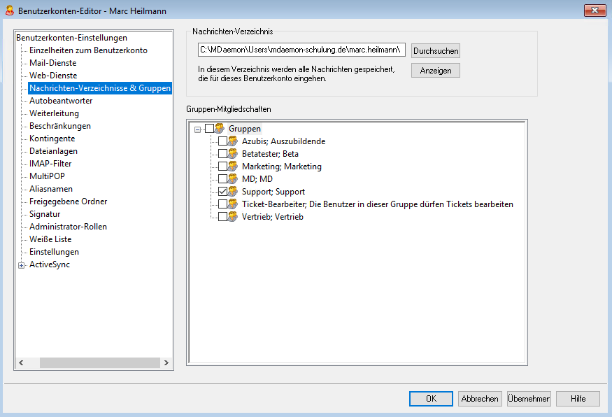 Unter "Gruppenmitgliedschaften" können Sie diesem Benutzer verschiedene Gruppen zuweisen.