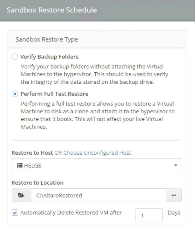 Wenn Sie "Perform Full Test Restore" auswählen, können Sie den gewünschten Host definieren. Ebenfalls können Sie hier einstellen, dass die wiederhergestellte Test-VM nach X Tagen gelöscht wird. Dazu wählen Sie die Option "Automatically Delete Restored VM after" aus und geben einen Ziffernwert in Tagen an.