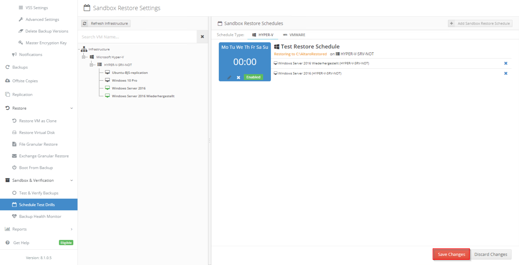 - Nachdem Sie die Konfiguration des automatisierten Plans abgeschlossen haben, können Sie per Drag and Drop die VMs, die von diesem Plan getestet werden sollen, in den Plan hineinziehen. Abschließend klicken Sie auf "Save Changes".
