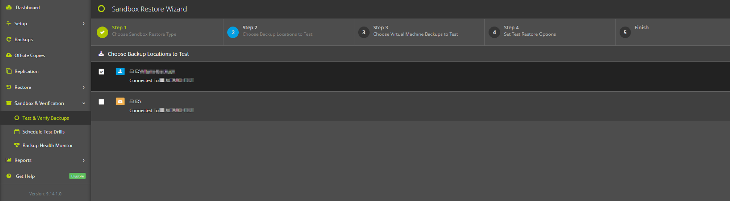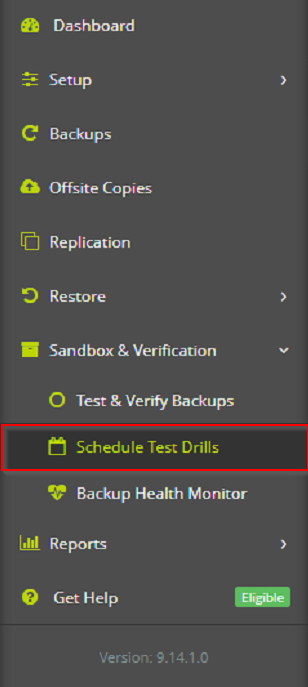 Wenn Sie im linken Menü auf den Bereich "Sandbox & Verification → Schedule Test Drills" klicken, finden Sie einen Zeitplaner, um Verify Backups und Full Test Restores automatisiert ablaufen zu lassen.