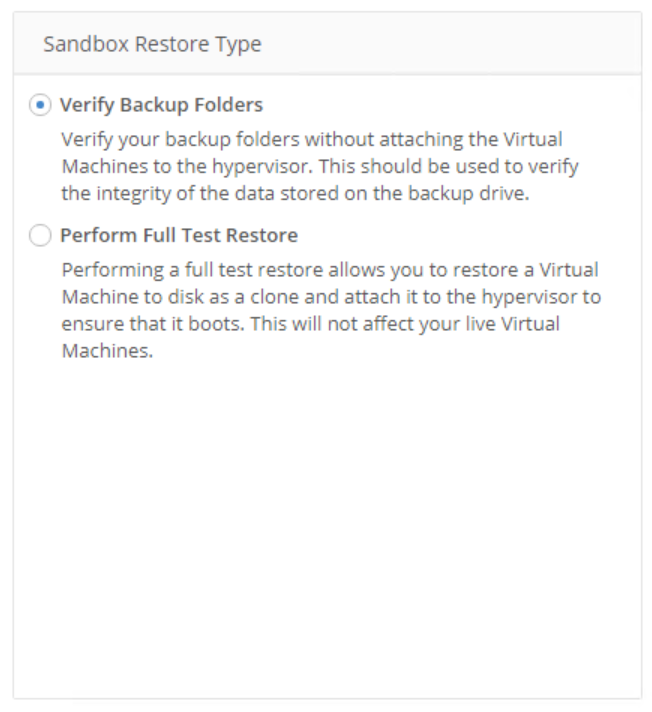 Unter dem Menüpunkt "Test & Verify Backups" können Sie manuell einzelne Backups auswählen und zwei verschiedene Tests durchführen: