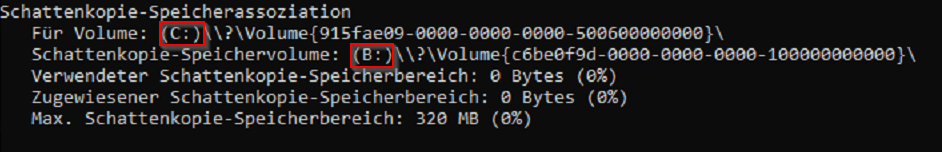 Es kann auch vorkommen, dass sich die Schattenkopie-Speicherassoziation eines Volumes nicht auf sich selbst, sondern auf einem anderen befindet. In diesem Beispiel liegt die von (C:) auf (B:):