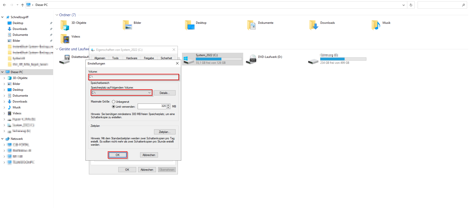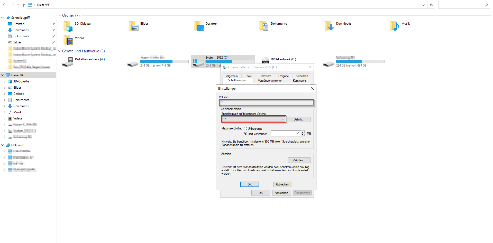 Zuerst muss der Schattenkopie-Speicher auf das Minimum von 320MB reduziert werden, damit dieser gelöscht werden kann: