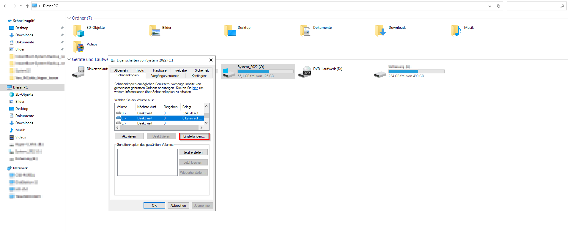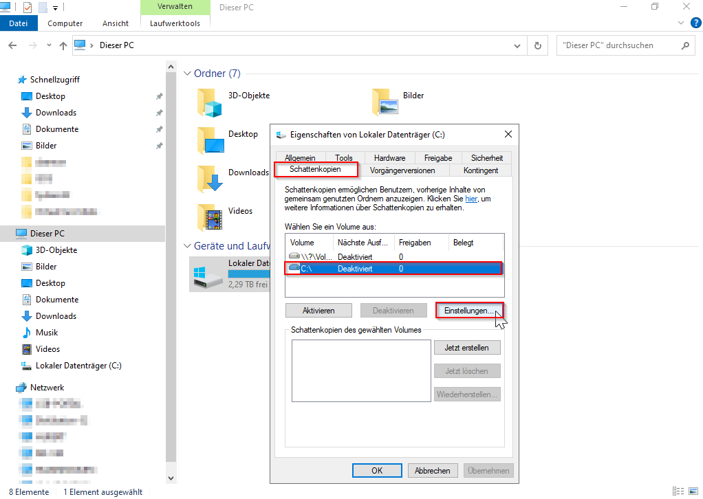 Klicken Sie auf die Registerkarte "Schattenkopien", wählen Sie das Laufwerk aus und klicken Sie anschließend auf "Einstellungen":