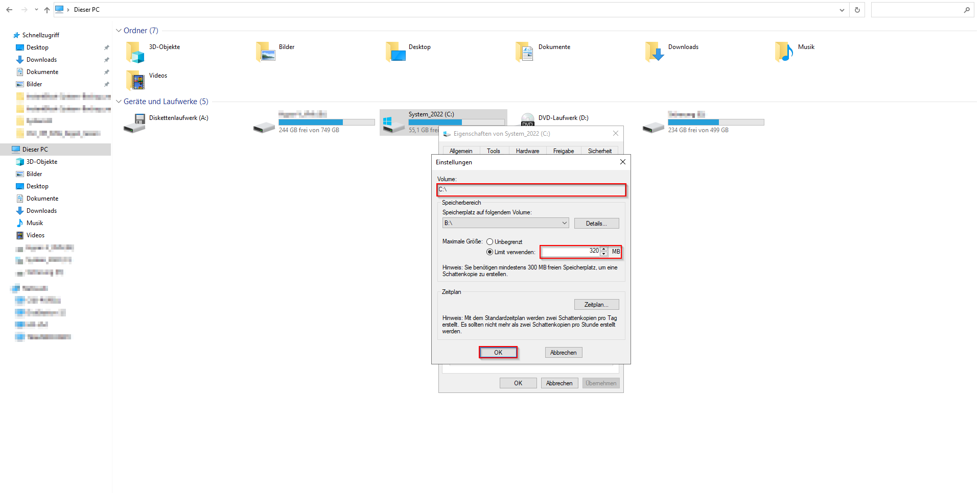 Bevor der Schattenkopie-Speicher auf ein anderes Volume verlegt werden kann, muss der Speicherplatz auf 320MB reduziert werden. Tragen Sie unter "Maximale Größe" 320MB ein und klicken Sie auf "OK":