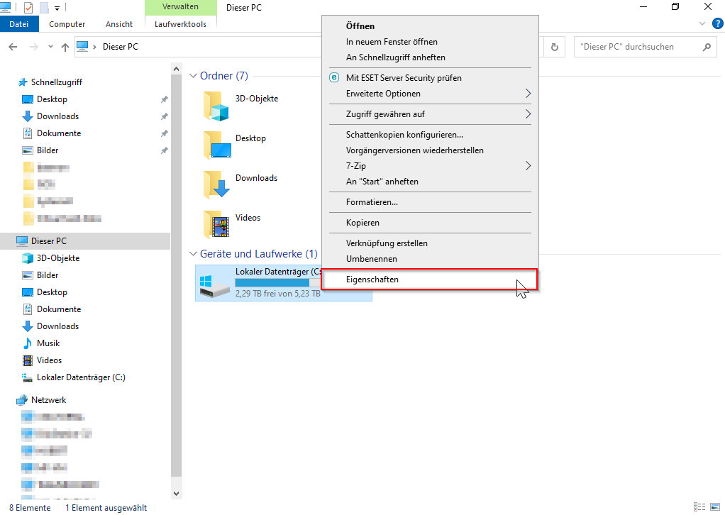 Öffnen Sie dafür den Windows Explorer und rufen Sie die Eigenschaften des entsprechenden Volumes auf: