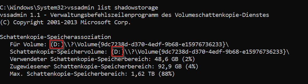 Hier in der GUI wird nun z.B. angezeigt, auf welchem Laufwerk sich der Schattenkopie-Speicher von (C:\ ) befindet