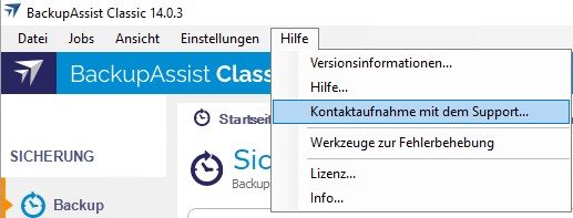 - Klicken Sie im BackupAssist Classic-Menü oben auf "Hilfe" und wählen Sie "Kontaktaufnahme mit dem Support..."