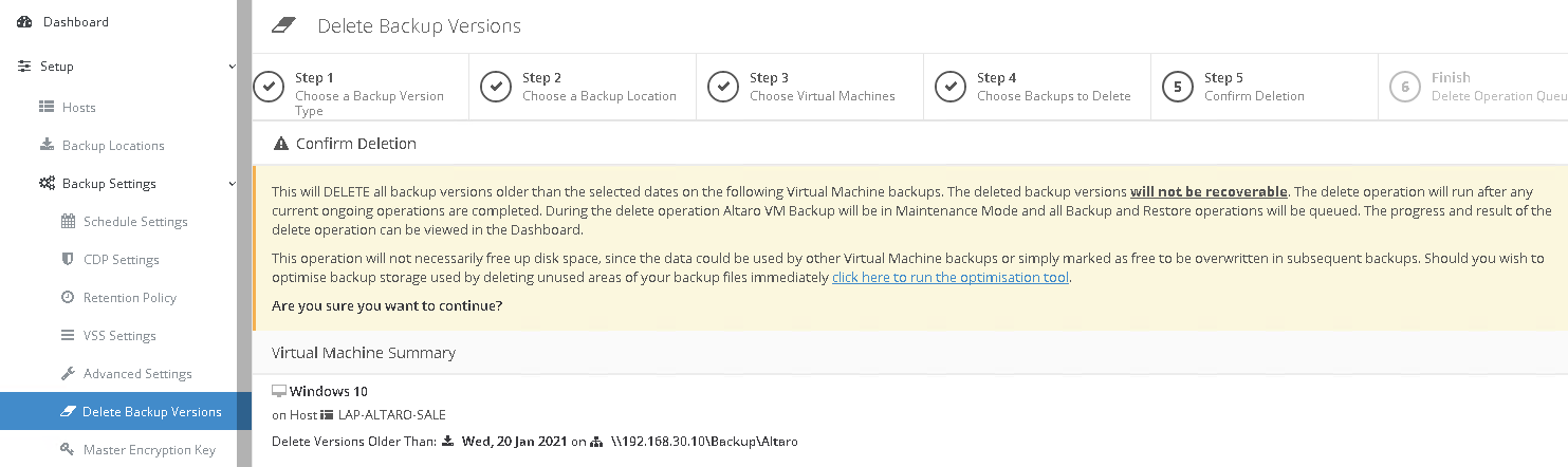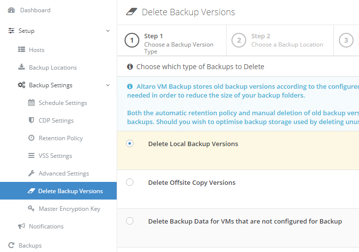 Sie können im Menü "Delete Backup Versions" manuell Backup-Versionen aus dem Backup und Offsite-Backupziele löschen.
