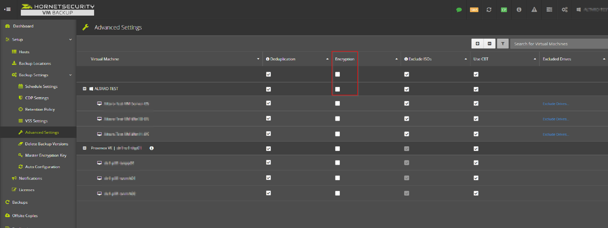 In den "Advanced Settings" von Altaro VM Backup lassen sich die Deduplikation, Verschlüsselung sowie der Ausschluss von einzelnen VHD/ VMDK-Laufwerken oder auch an die VM gebundene ISO-Files (zum Beispiel Installationsmedien) für jede VM einzeln aktivieren oder deaktivieren. Hierzu ist eine Unlimited / Unlimited Plus / Subscription Lizenz notwendig.