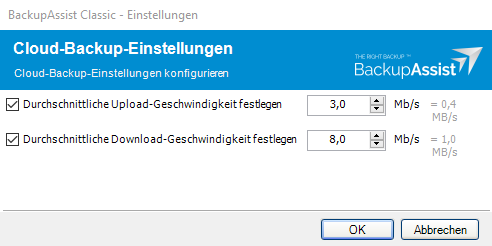Sie können in BackupAssist Classic im Menü unter "Einstellungen | Cloud-Backup-Einstellungen" die gewünschte durchschnittliche Upload- und Download Geschwindigkeit festlegen und somit die Bandbreite reglementieren.