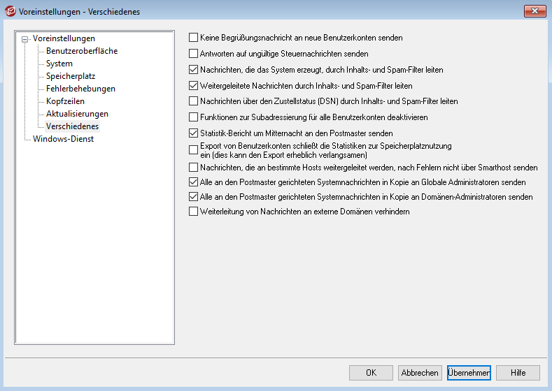 Dafür öffnen Sie Ihren MDaemon Email Server und gehen in Einstellungen → Voreinstellungen → Verschiedenes