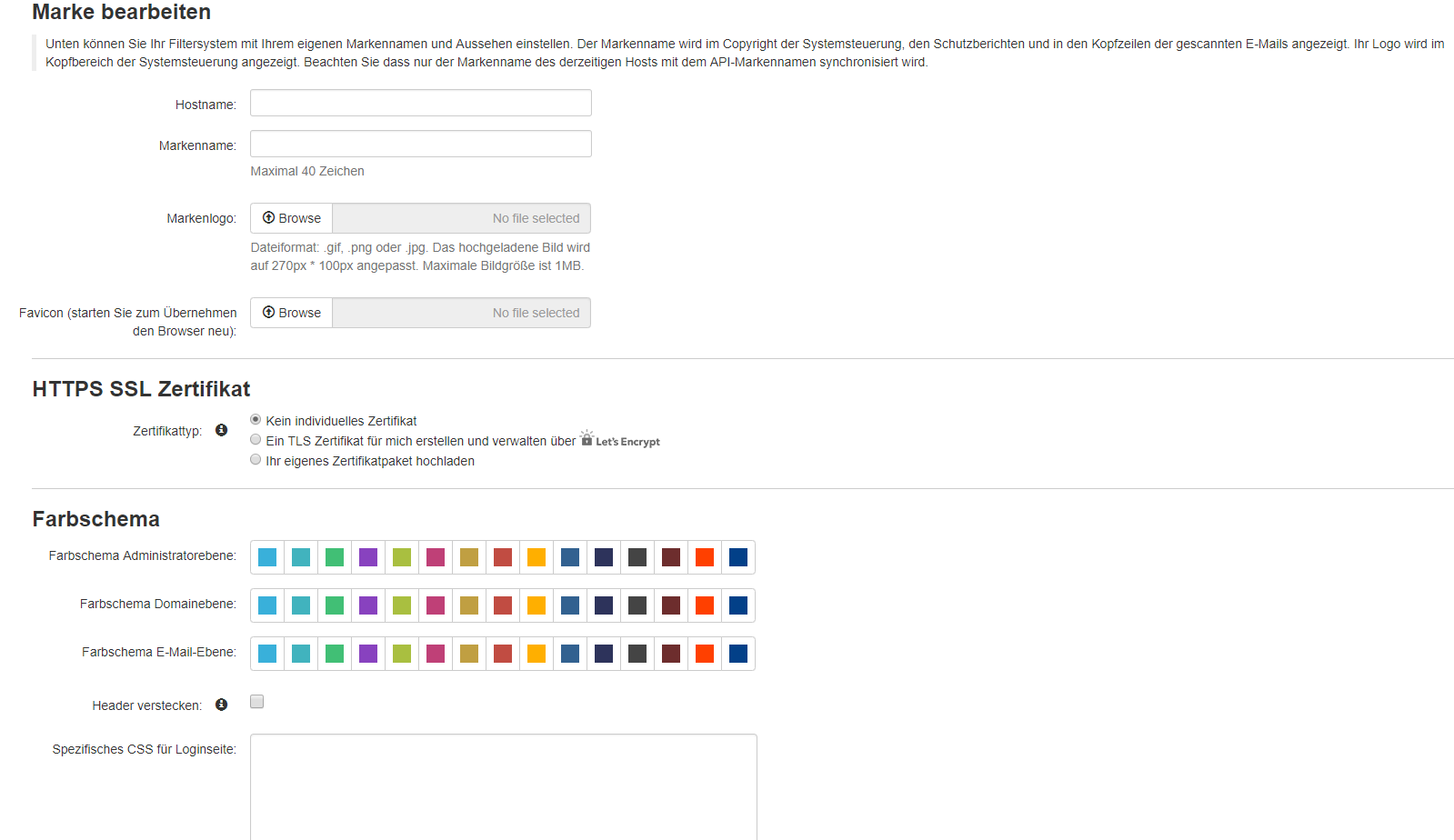 Unterhalb des Farbschemas gibt es noch die Option "Header verstecken". Diese Option sorgt dafür, dass der obere Bereich des Mail Assure Gateways, in dem die Abmeldung und Einstellung der Sprache möglich ist, verschwindet.