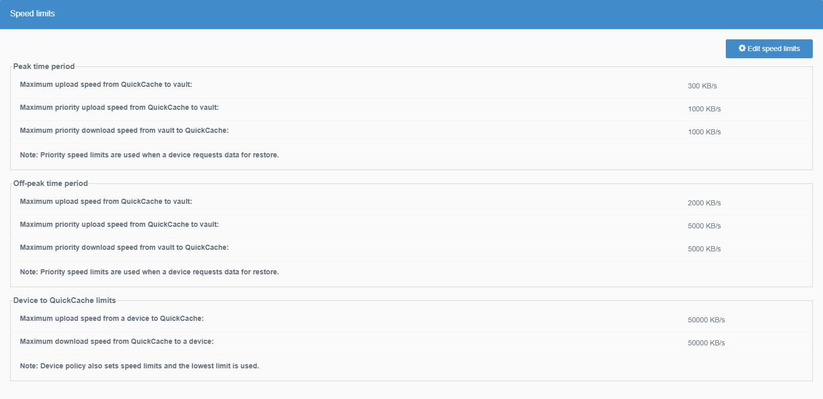 Mithilfe der "Bandwith Schedule" lassen sich einmal die maximalen Bandbreiten der Datenübertragung sowie die "Off-peak hours" einstellen. Dies sind die Zeiträume, an denen keine Backups der Endgeräte aus dem Cache in den Vault hochgeladen werden dürfen. Hier sollten die Zeiträume gewählt werden, bei der die Bandbreite für den normalen Geschäftsbetrieb benötigt werden.