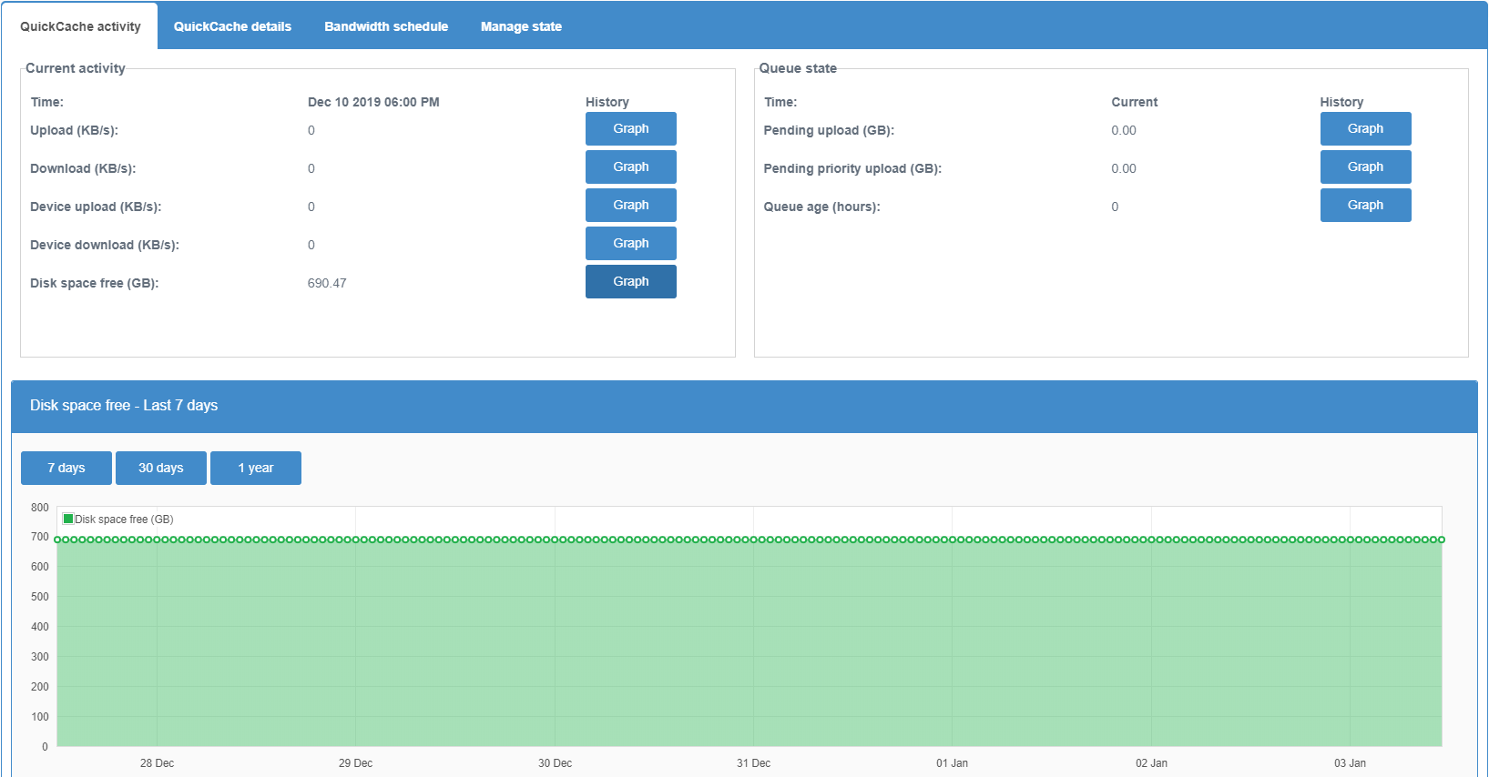 Um nun alle Details zu einem bestimmten QuickCache einzusehen, wählen Sie diesen in der Übersicht unter "QuickCaches" aus. Im Reiter "QuickCache activity" gibt es die Möglichkeit, Graphen mit verschiedenen Informationen wie beispielsweise der Menge an bereits hochgeladenen Daten einzusehen.