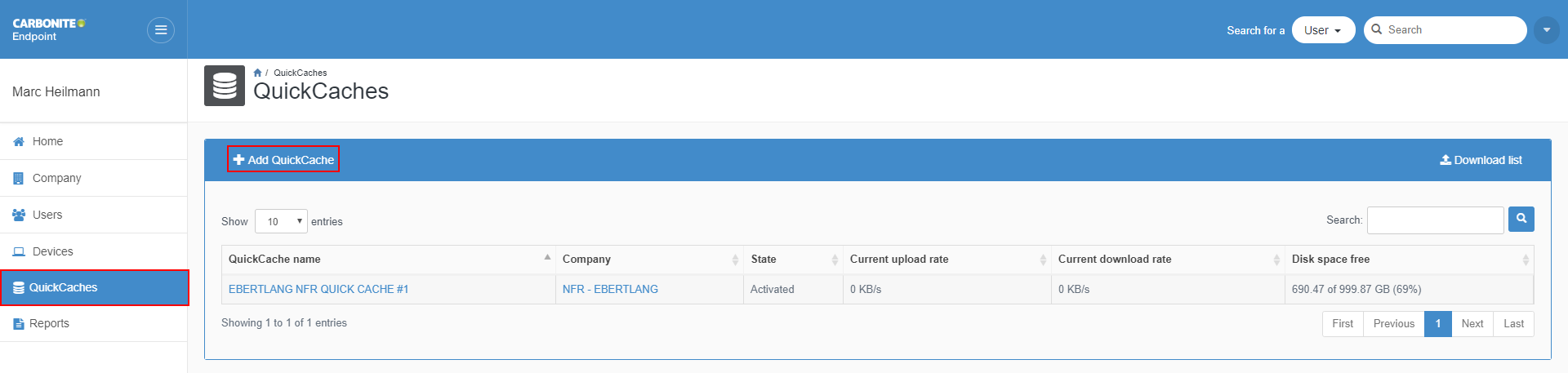 Um einen QuickCache zu erstellen und zu konfigurieren, melden Sie sich am Vault Dashboard von Carbonite Endpoint an und wählen Sie im Auswahlmenü auf der linken Seite den Punkt "QuickCache".