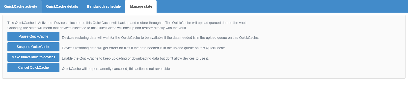 Abschließend kann mit dem Reiter "Manage state" der QuickCache pausiert, suspendiert, als nicht verfügbar markiert oder abgeschaltet werden: