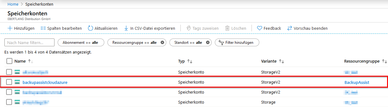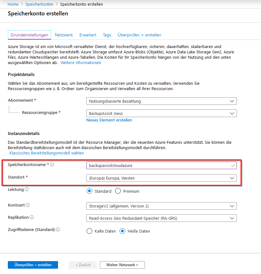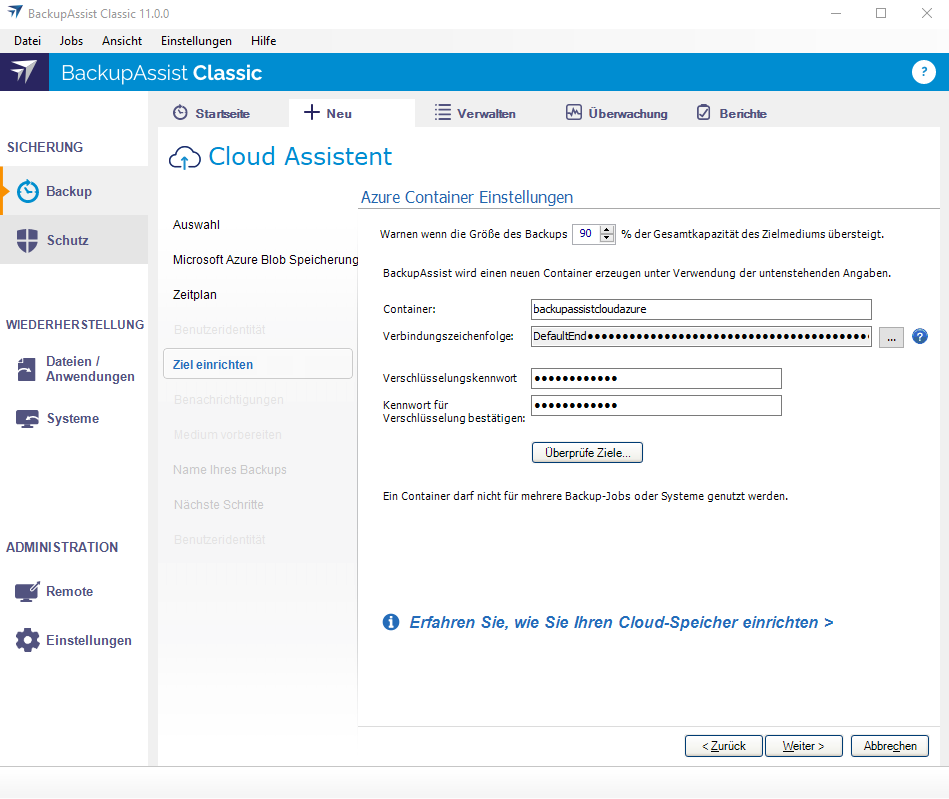 Container ist der von Ihnen definierte Name – in diesem Beispiel ist das der "backupassistcloudazure".