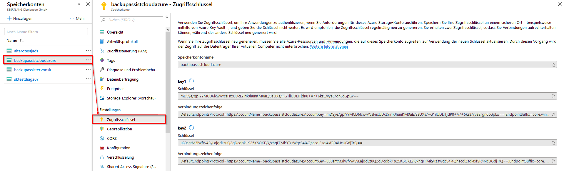 Kopieren Sie hier bitte den Schlüssel und die dazugehörige "Verbindungszeichenfolge" heraus. Diese brauchen Sie zum Erstellen des Backups.