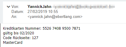 Eine typische E-Mail mit Kreditkarteninformationen könnte wie folgt aussehen: