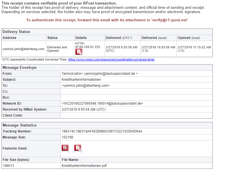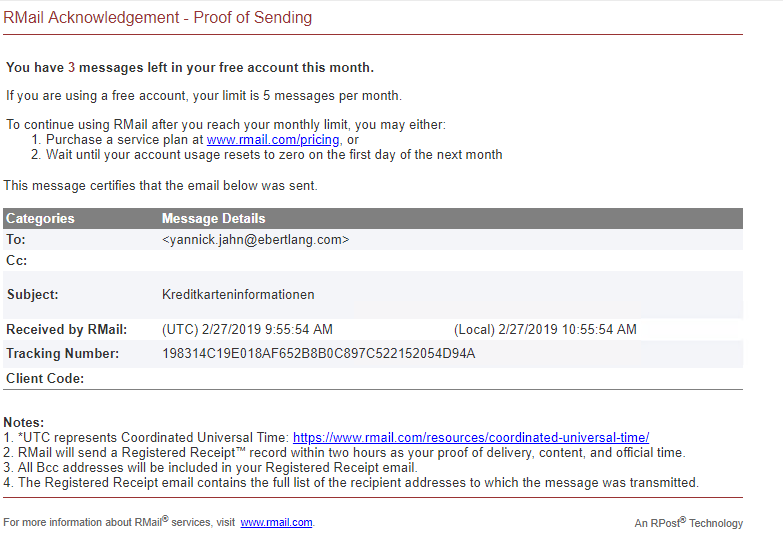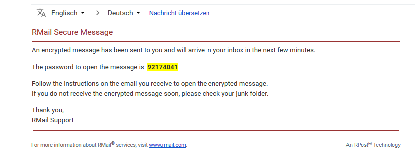 Der Absender erhält beim Anstoßen ebenfalls eine Rückmeldung seitens RMail. Darin steht Folgendes: