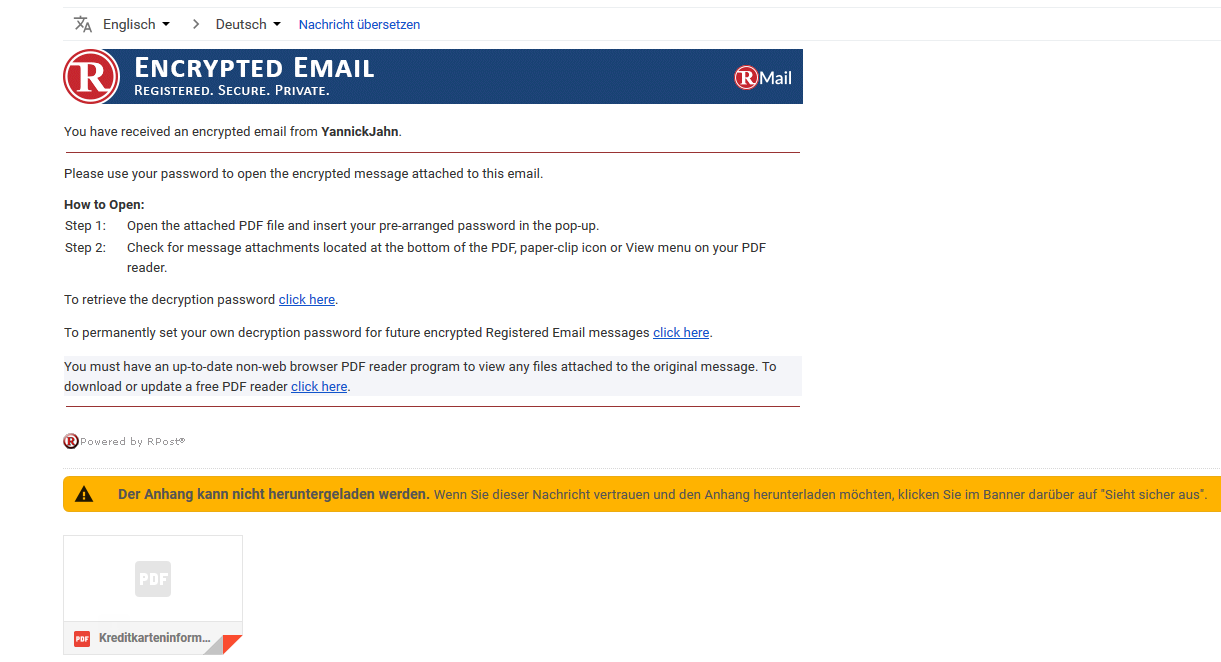 angehängte PDF-Dokument ist verschlüsselt und kann nur mit einem