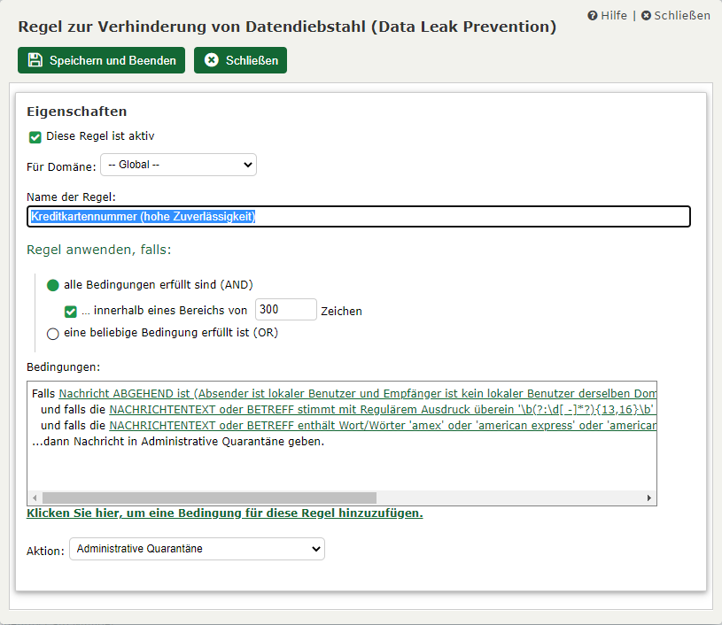 Öffnen Sie dazu zunächst die webbasierte Oberfläche von SecurityGateway und setzen Sie unter "Sicherheit → Data Leak Prevention" den Haken bei "Kreditkartennummer" und "Kreditkartennummer (hohe Zuverlässigkeit)", um das Feature zu aktivieren.